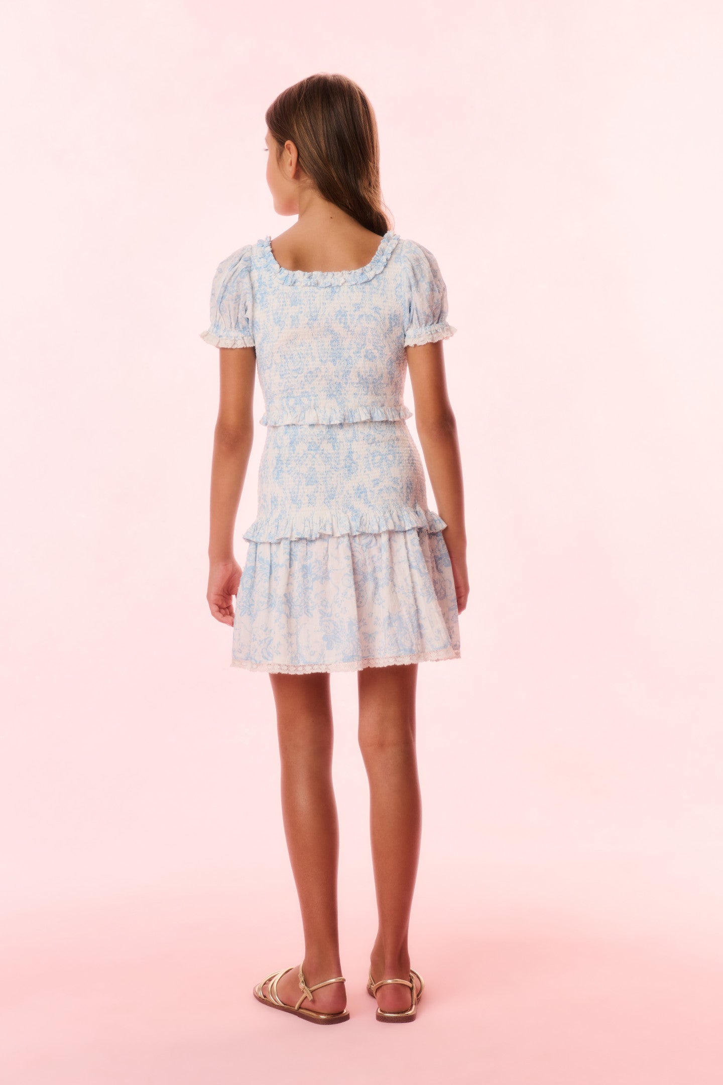 Sunshine ready in the Banson Dress. This pretty piece features our Italian-inspired print of the season, short cap sleeves, smocking at the bodice, ruffle tiers, and a flowy skirt.