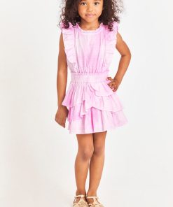 Meet our Decker Dress for girls in 100% cotton with custom lace. This easy frock has a ruffle-trimmed collar, buttons down center front, flutter sleeves, an elastic waist and overlapping asymmetrical ruffles at the skirt.