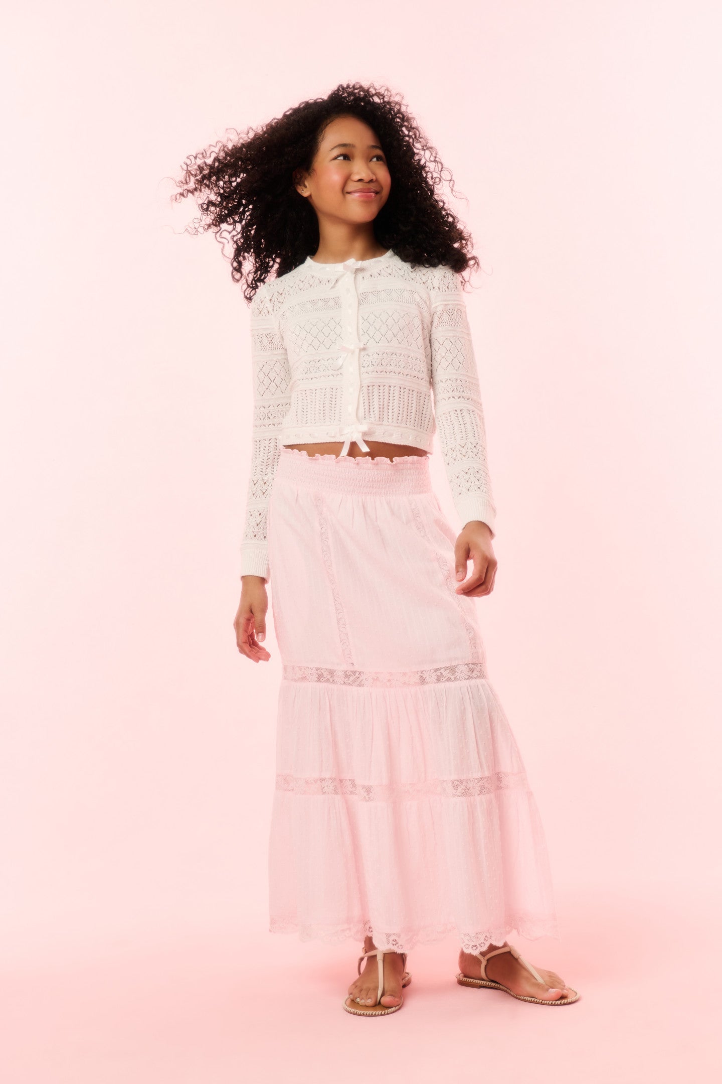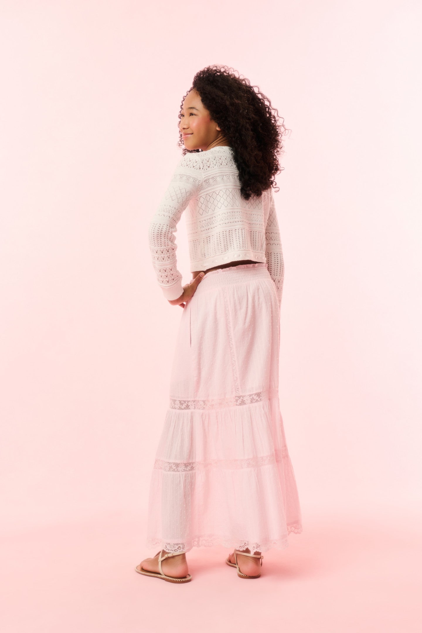 Stay cozy and cute in the Iriselle Sweater. This knit features intricate woven techniques and embroideries all over giving it a unique look and feel. The piece is finished with ribbon woven throughout for a feminine touch.