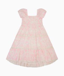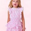 Our minis are so sweet in the Muriella Dress. This charming dress features our new pretty pink print of the season. With short flutter sleeves, the airy dress is finished with a sweepy skirt.