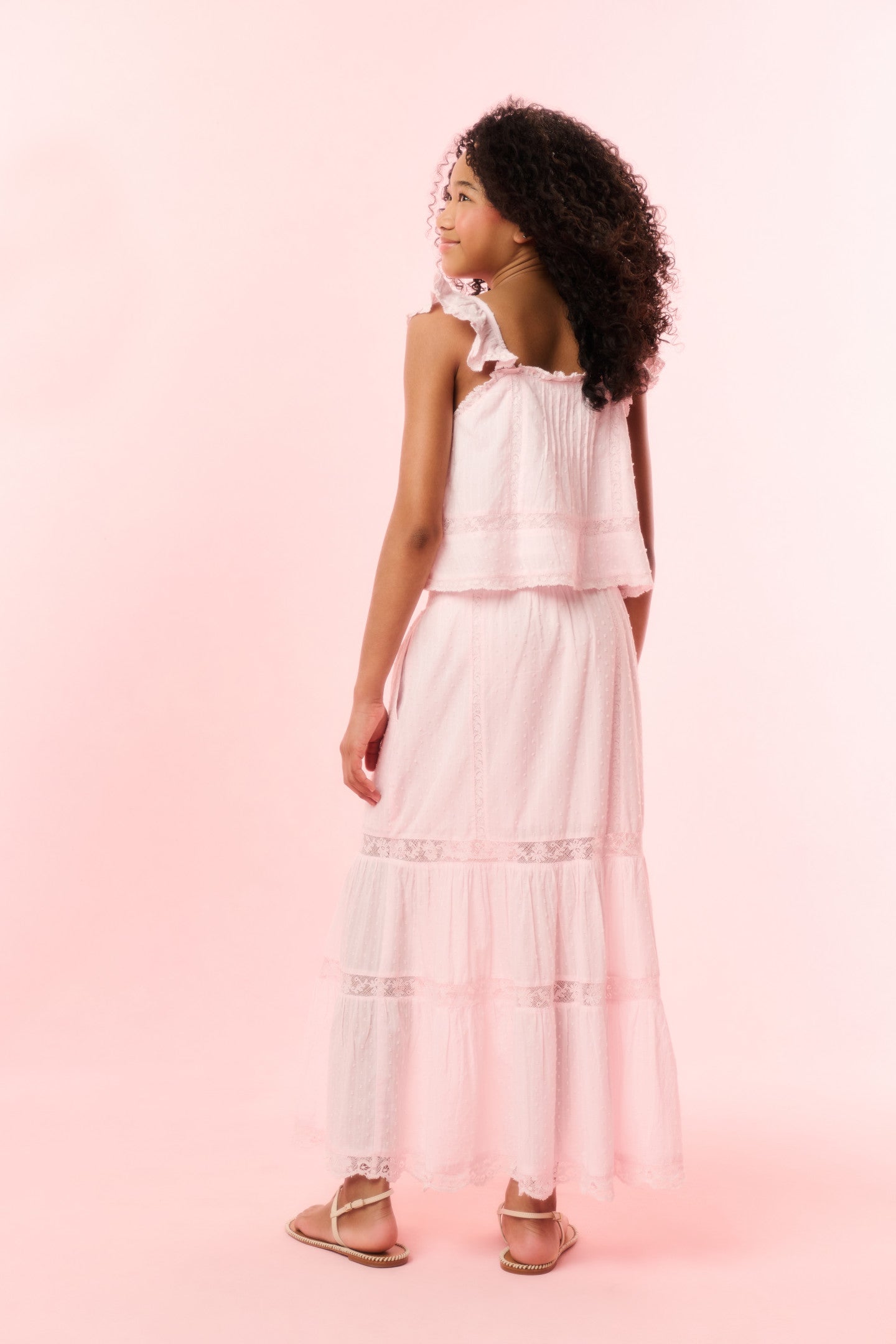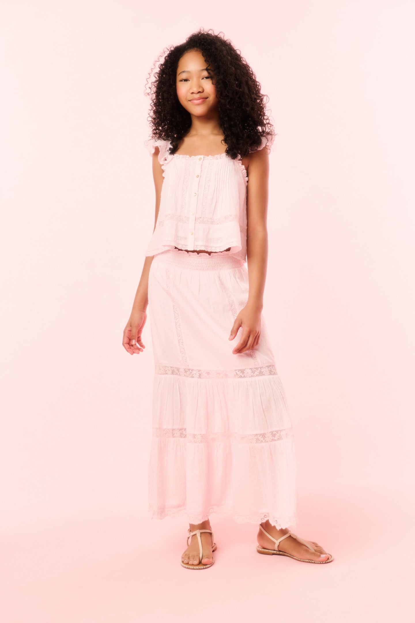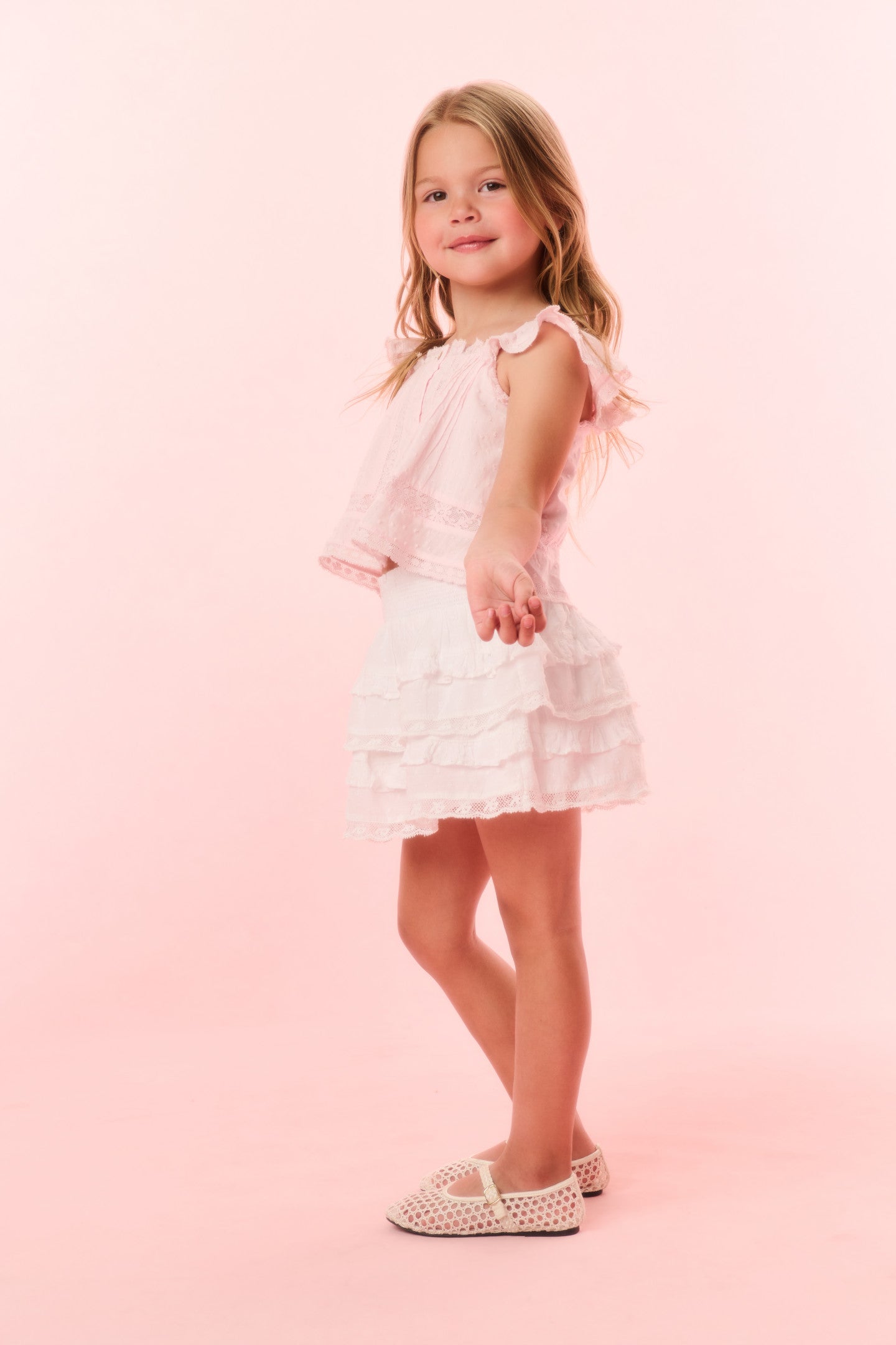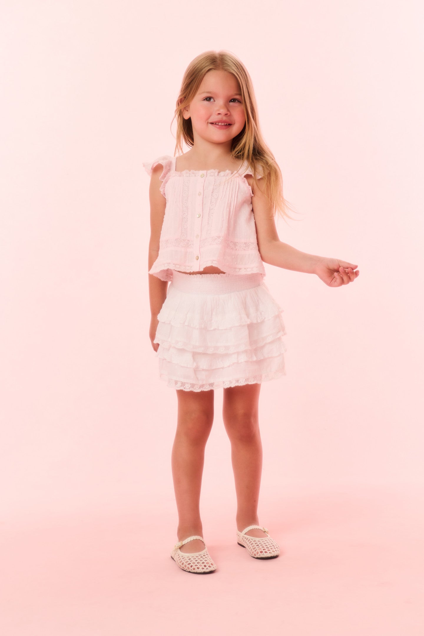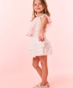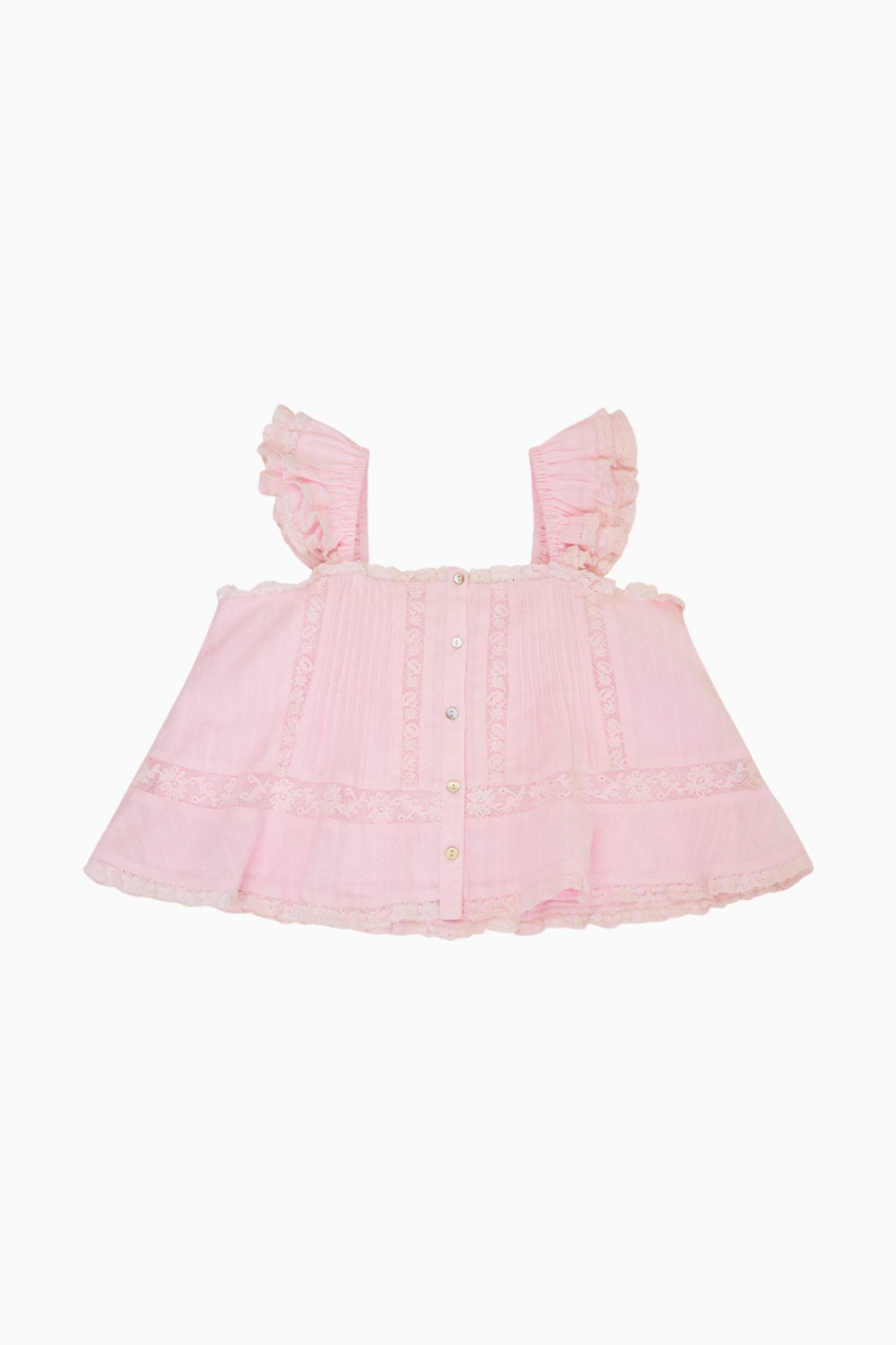 Timeless and classic, our girls are forever cute in our Norabel Top. This Victorian-inspired piece features lace trims and insets throughout, tank-like flutter sleeves, and tiny buttons down center front.
