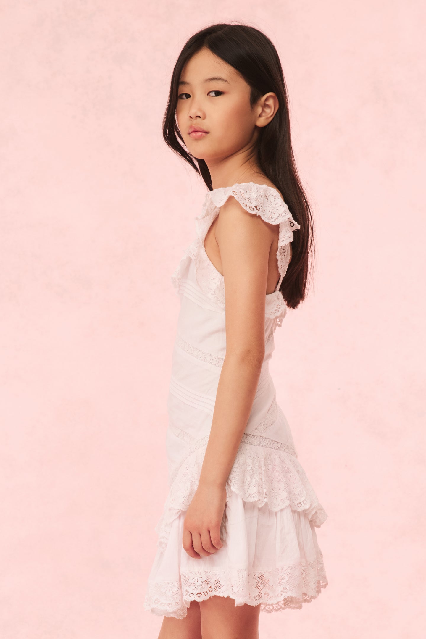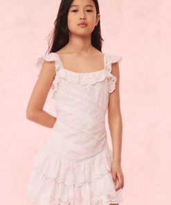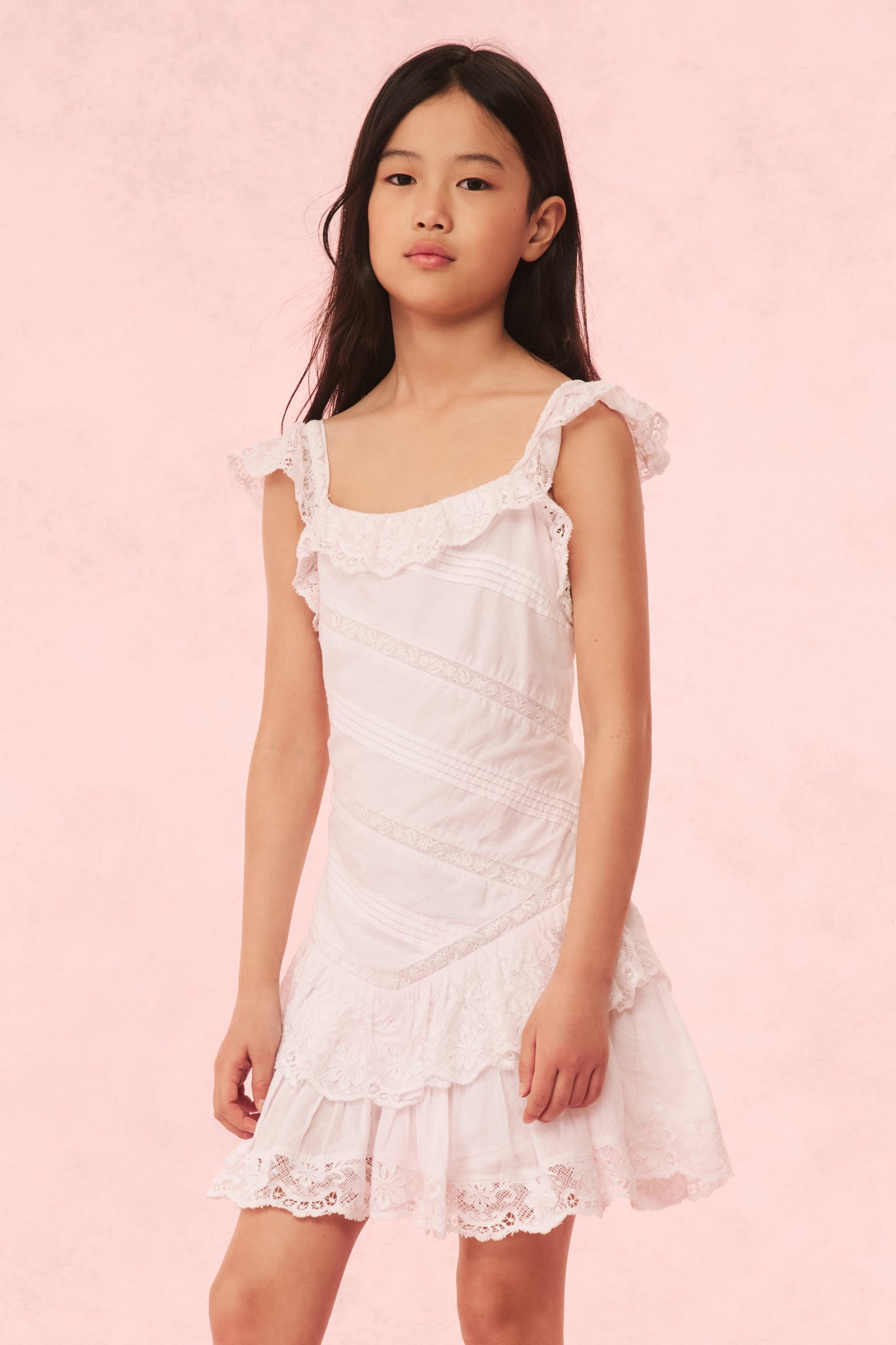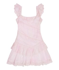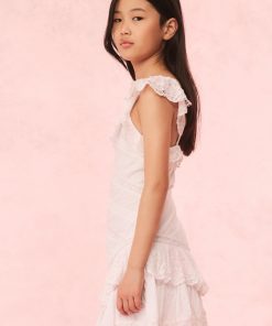 Put on the pretty in the Poppi Dress. This warm weather dress arrives with a crisp cotton poplin fabric with lace details all over. The piece begins with short, lace flutter sleeves that fall to a square neckline with a lace-adorned ruffle. The bodice features lace insets and embroideries that flows to a tiered skirt with intricate details.