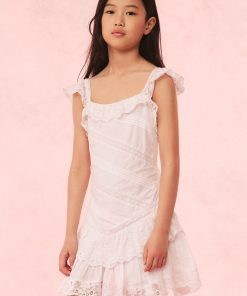 Put on the pretty in the Poppi Dress. This warm weather dress arrives with a crisp cotton poplin fabric with lace details all over. The piece begins with short, lace flutter sleeves that fall to a square neckline with a lace-adorned ruffle. The bodice features lace insets and embroideries that flows to a tiered skirt with intricate details.