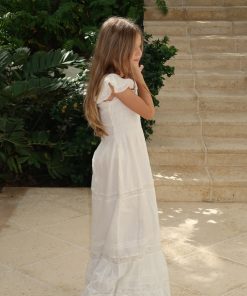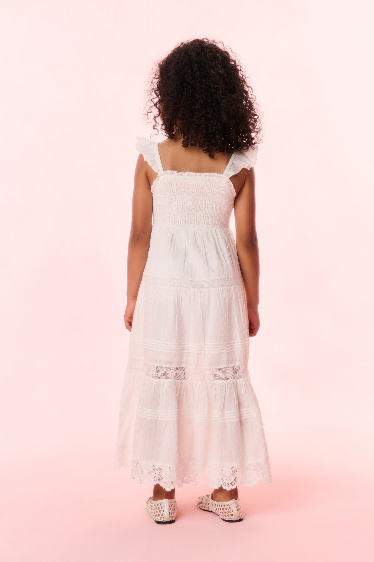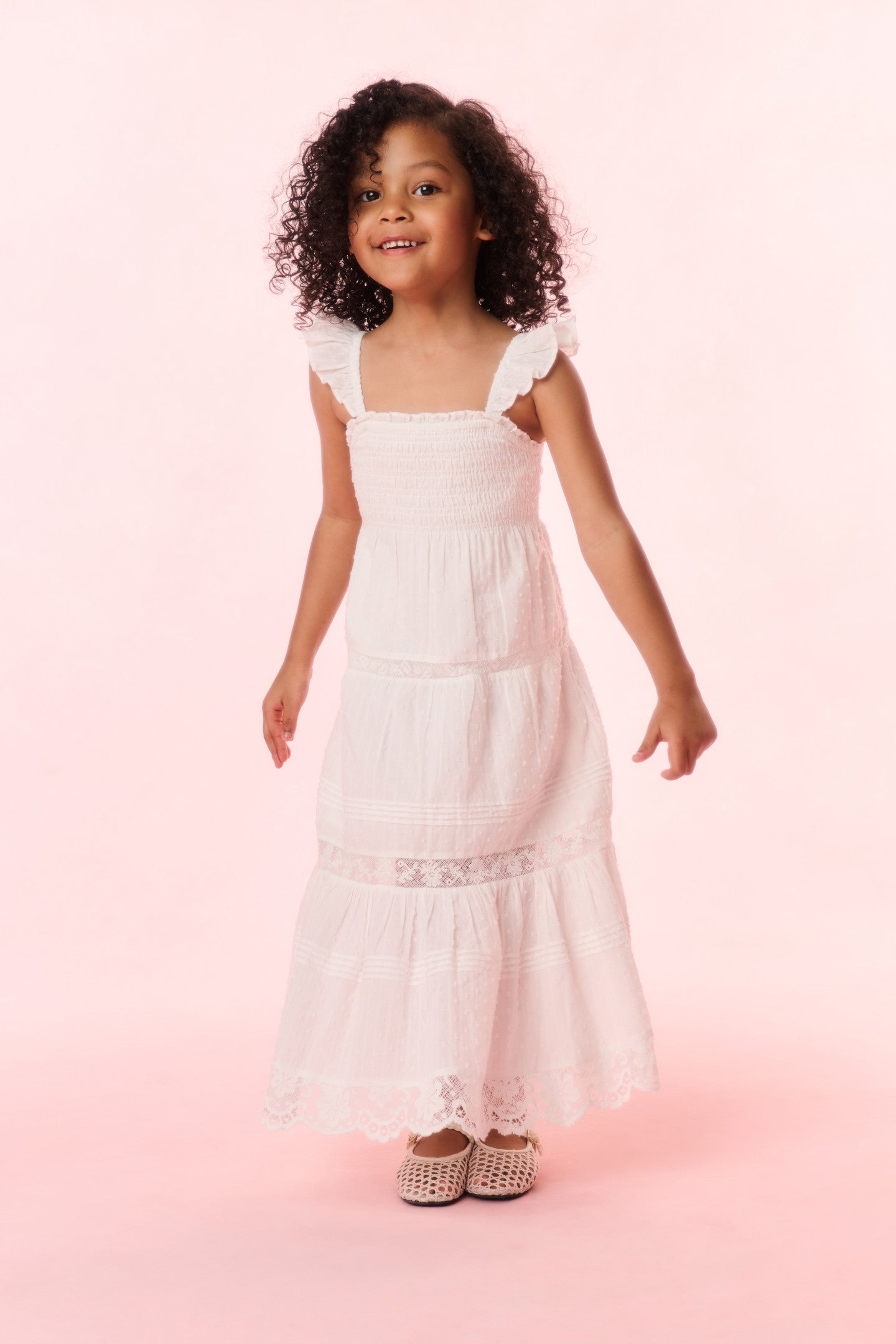 Introducing the Rhiannon Dress. This easy frock features tiny flutter sleeves, a square neckline, lace trims throughout, and an airy, flowy silhouette.