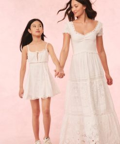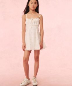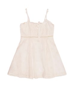 Dressed to impress in the Taralynn Dress. This pretty sun dress features a cotton fabric with intricate eyelet details all over. Easy and breezy, the piece features thin spaghetti straps, a keyhole with a self-tie detail at center front, and an airy skirt.