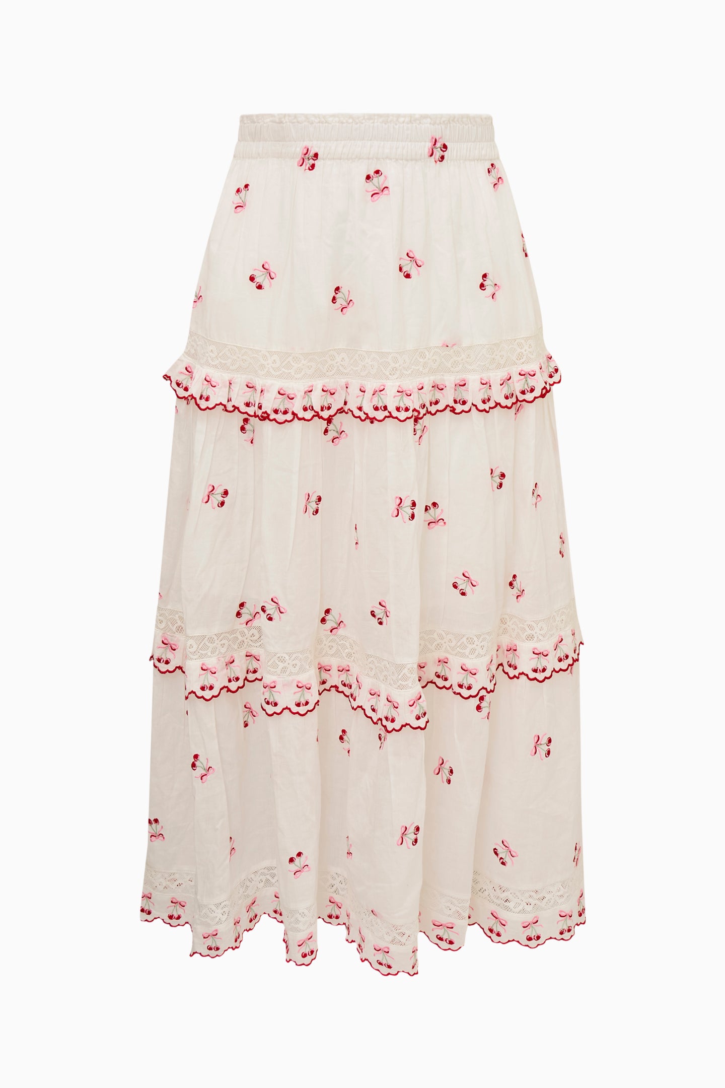 Introducing the Zinna Skirt as part of our America’s Sweetheart Cotton Collection. This sweet multi-tiered skirt debuts with printed cherries, scallop details, and an elasticated waistband for easy and comfortable wear.