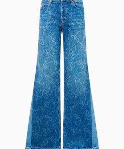 So in love with the Ambrina Jeans. These 70s-inspired jeans have our signature Luna Rosa Beaux print lasered into the denim giving it a resist look with fading in certain areas. With a wide leg and flare bottom, the mid rise jeans have a solid contrast triangle gusset at the leg. They have a regular fit until below the knee which they then flare out.