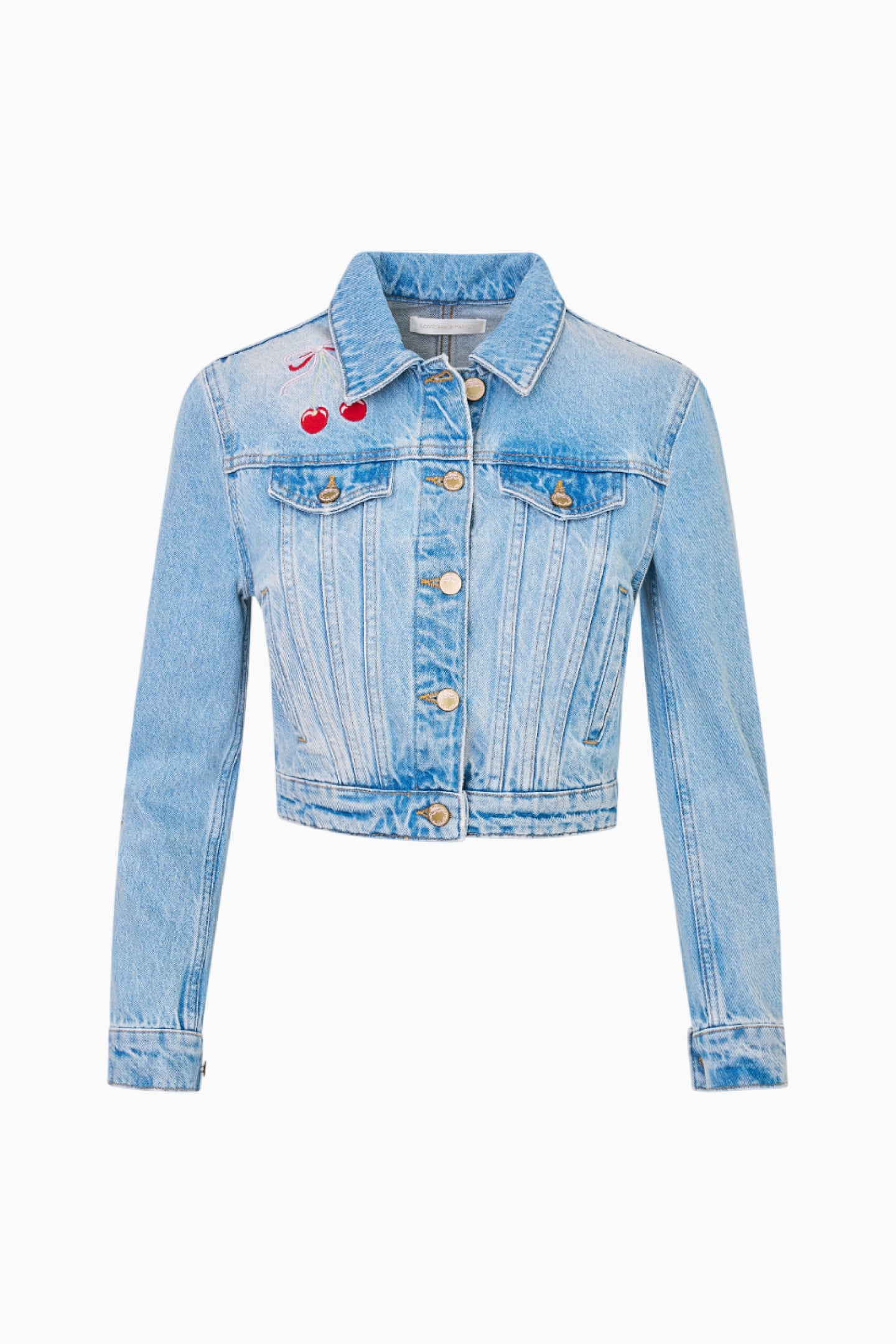 Our Bardot Jacket arrives as part of our America’s Sweetheart Cotton Collection. This flirty denim jacket features a playful larger scale cherry embroidery at the chest. With a cropped, slim fit, this piece has slim sleeves, bustier-inspired seams at the bodice, flat pockets, tabs at the sides at the waist, and hits at around the natural waist.