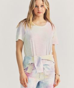 Our Calix Tee returns, your new favorite t-shirt in 100% hand tie-dyed cotton with distressed edges. This easy top has a loved look with its classic scooped crewneck, short sleeves and relaxed fit. Pair it with one of our many Ruffle Mini Skirts.