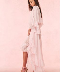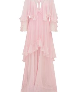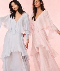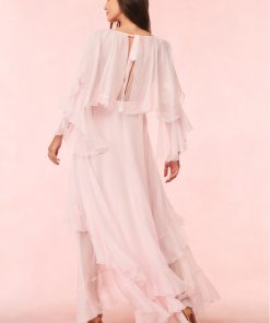 Introducing the Collia Dress. One of the hero pieces of our Spring 2025 runway show and our Founder and Creative Director, Rebecca’s, favorite, Collia Dress debuts with a diaphanous chiffon designed from 100% silk. The viscose, drapey chiffon gives this piece a Bohemian-inspired look and feel. This stunning event gown features a plunging, deep v-neckline with a cape around the shoulders, lovely boho-inspired bell sleeves, a multi-tiered skirt that goes high-to-low at the front then levels out around the hem. Delicate ruffles adorn each tier and the cape. A chiffon self tie detail sits at the back with an open slit. This piece comes fully lined and includes a side seam zipper.