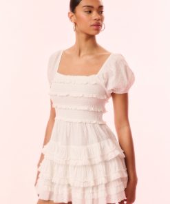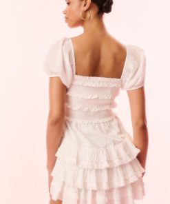 Feeling dreamy in the Fellows Dress. This Victorian-inspired mini features a striped cotton dobby fabric with tiny swiss dots interwoven all over for a textural and vintage-inspired feel. This piece begins with short puff sleeves with elastication at the openings for comfort, a square neckline that flows to a smocked bodice with horizontal laces stripped throughout, followed by a fitted waist that releases into a flirty skirt.