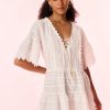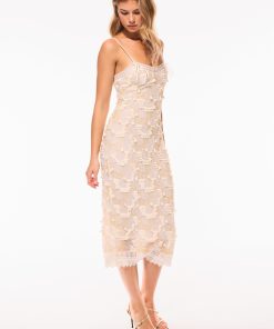 Seaside chic in the Harlette Dress. This gorgeous beachside-inspired midi debuts with a beaded mesh fabric featuring a stunning arrangement of shell-and-sequin embellishments all over. With a cami and fitted shape, the dress is finished with crochet lace at the neck and hemline. A zipper is included.