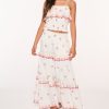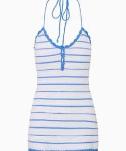 Nautical and coastal chic in the Lilibelle Dress. This warm weather mini arrives with a knit striped crochet fabric featuring crochet scallop trims throughout. The mini features a halter neckline with scallop details, a plackett down the front with crochet buttons, and loop straps made from a crochet chain halter. This piece is finished with a scallop detail at the hem. Pair with the Lamiya Cardigan for a matching layer.