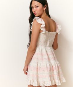 The Melitta Dress makes her dreamy debut designed from a cotton voile fabric with a pretty printed lace effect and intricate details like vintage-inspired laces stripped throughout. This Victorian-inspired piece begins with flutter sleeves, a straight neckline with chevron lace detailing at the bust, a sweet tiered skirt, and smocking at the back for ease and comfort.