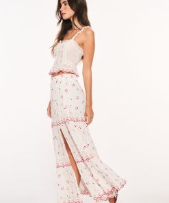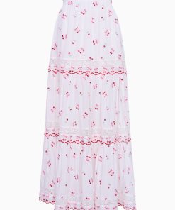 Introducing the Patten Skirt as part of our America’s Sweetheart Cotton Collection. This nostalgic midi stuns with custom developed scalloped trim featuring embroidered dancing cherries all over. With an A-line silhouette, the skirt has smocking at the waist before falling to the multi-tiered skirt. The piece is completed with pockets.