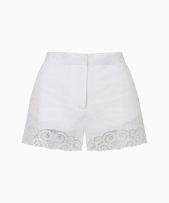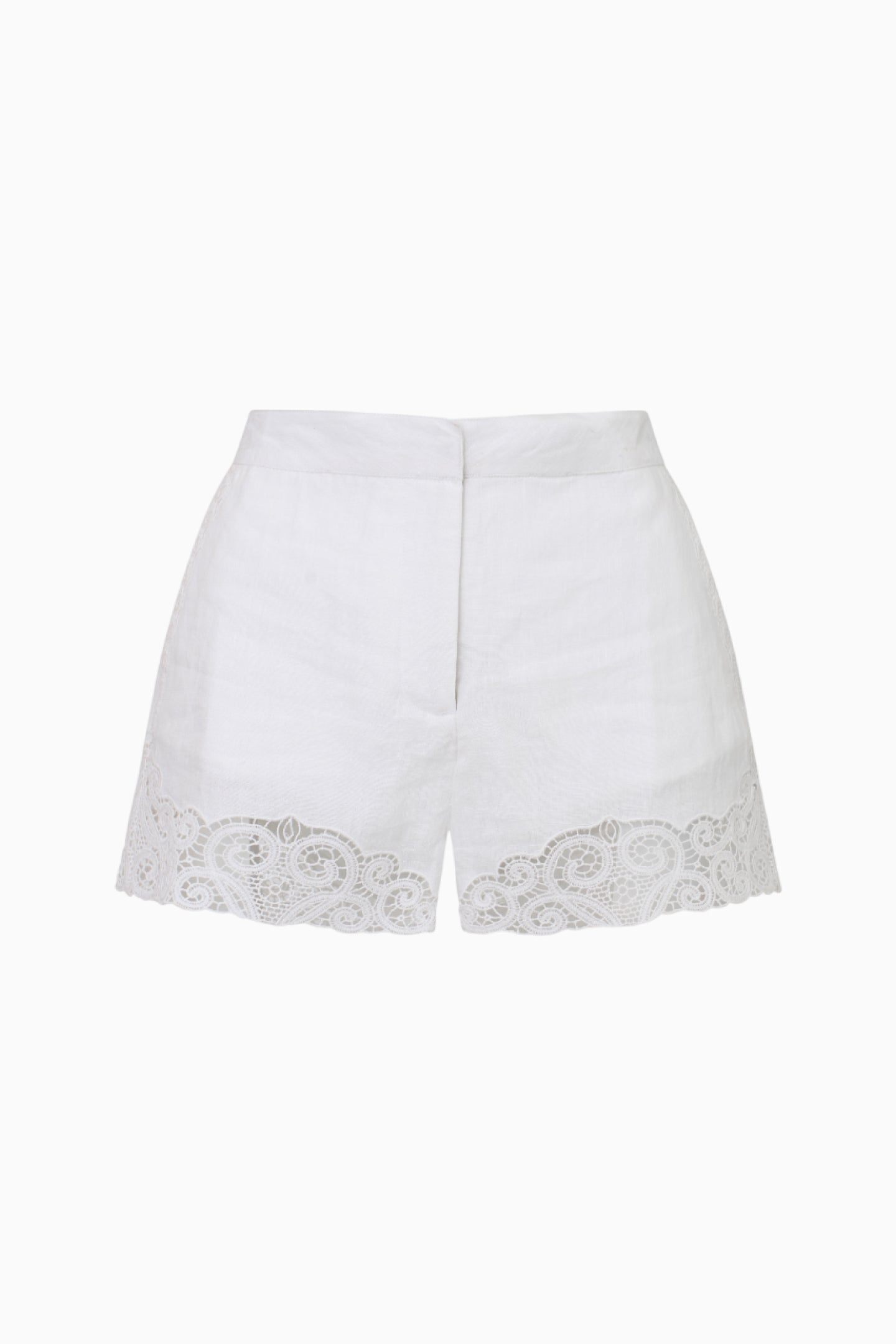 Elevate your wardrobe with the Quindi Shorts. These chic bottoms arrive in a crisp, lightweight linen featuring custom developed battenburg lace that’s used as a wide trim around the leg openings giving it an elegant look. Ideal for the summertime, easy shorts have a fixed waist for a flattering fit and a center front zipper closure.