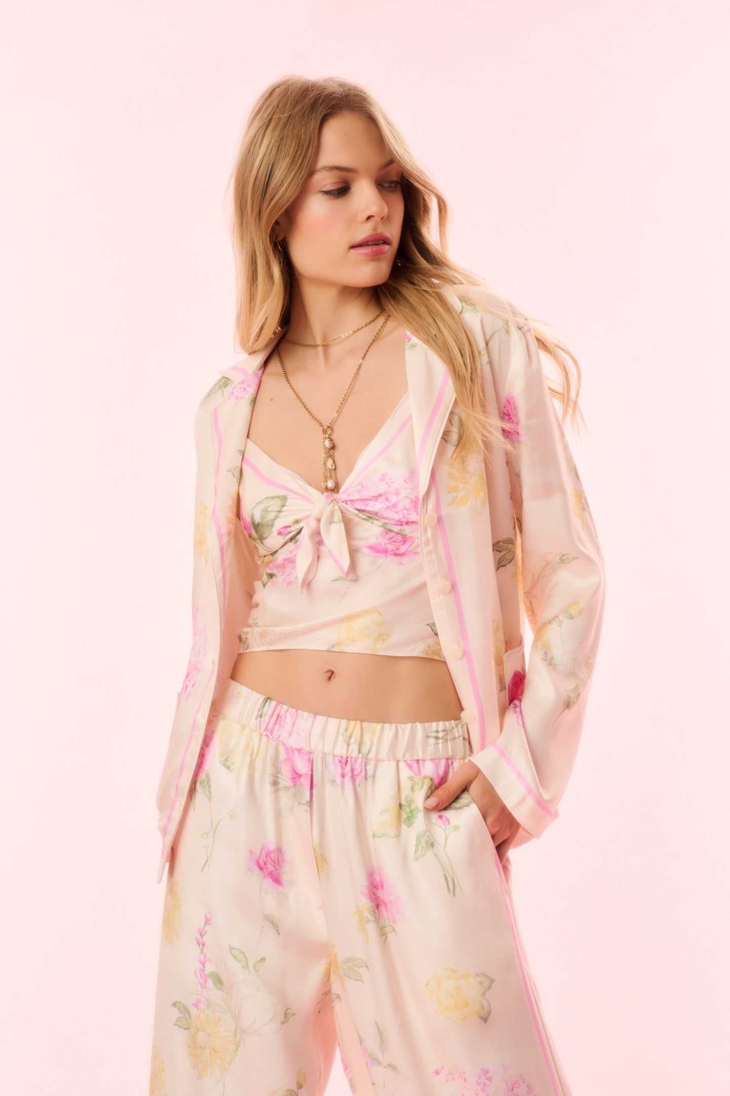 Introducing the Renetta Top. This elevated pajama top features an Italian-inspired print with hand-painted flowers in a romantic arrangement and stripes throughout. The loose top begins with a camp collar, buttons down center front, long sleeves, and pockets at the waist area. Pair with the Helia Pant for a full set.