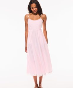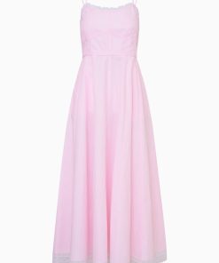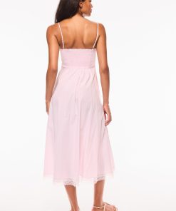Look sweet in the Sandara Dress. This sophisticated midi dress debuts with a crisp poplin fabric with vintage-inspired laces. With an A-line silhouette, the piece begins with spaghetti straps, smocking at the back that falls to a sweepy skirt with seams giving it a flattering shape.