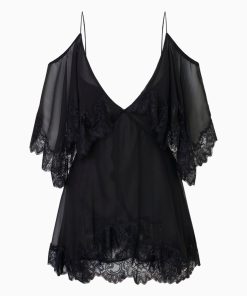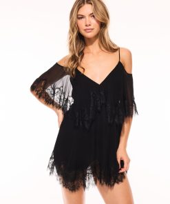 Introducing the Selune Dress. This Bohemian-inspired mini debuts in a gorgeous 100% silk diaphanous chiffon. Beginning with spaghetti straps, the off-the-shoulder piece features a deep v-neckline, a cape that drapes around the shoulders, an A-line tiered skirt, and wide chantilly laces around the shoulder and at the hem of the skirt.