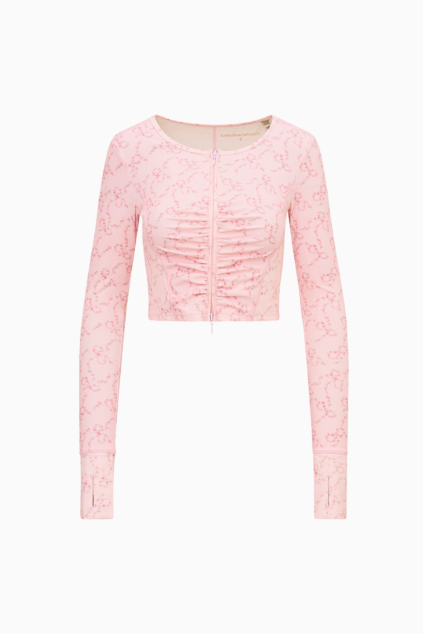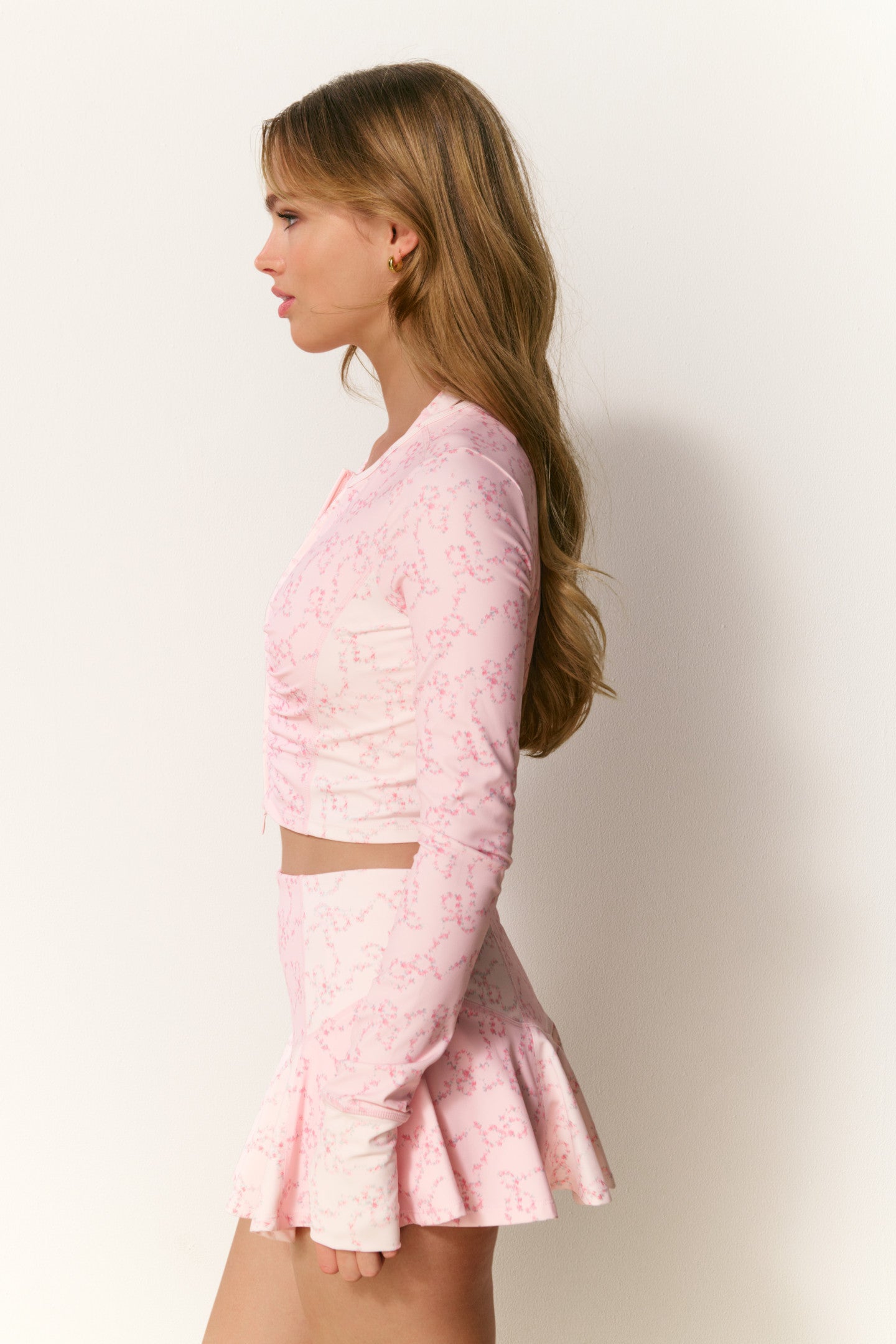 Our best-selling Sindri Jacket is back. Designed for the girls on the go, this active layer is lightweight and ideal for cool days outside. The jacket features our ditsy floral print, a ruched center for a flattering fit, a center-front zipper, a slightly cropped hem and long sleeves. Pair with the Dierdra Bra, Livetta Skirt, or Santiana Legging for the full set.