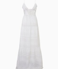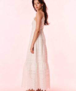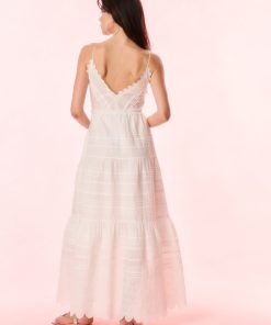 Feeling feminine in the Terria Dress. This evening time maxi dress debuts with a summertime cotton fabric ideal for warm weather and vacation wear, adorned with gorgeous scallop embroidery, vintage-inspired laces, and tucking details. The piece stuns with thin spaghetti straps above an open neckline that falls to a fitted waist yoke that descends to a sweeping skirt with a beautiful arrangement of laces and tucks at the skirt followed by the scallop embroidery at the hem.