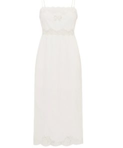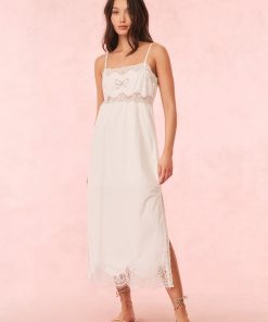 Classic in all the right ways, the Vinca Dress makes its debut. Designed from a crisp, poplin cotton fabric, this easy midi dress features vintage-inspired lace details stripped throughout the waist and at the hem, while a sweet bow detail sits at the chest. With a straight shape and loose fit, this piece features a straight neckline, adjustable spaghetti straps, and a straight column skirt with slits at both sides for a playful finish.