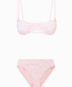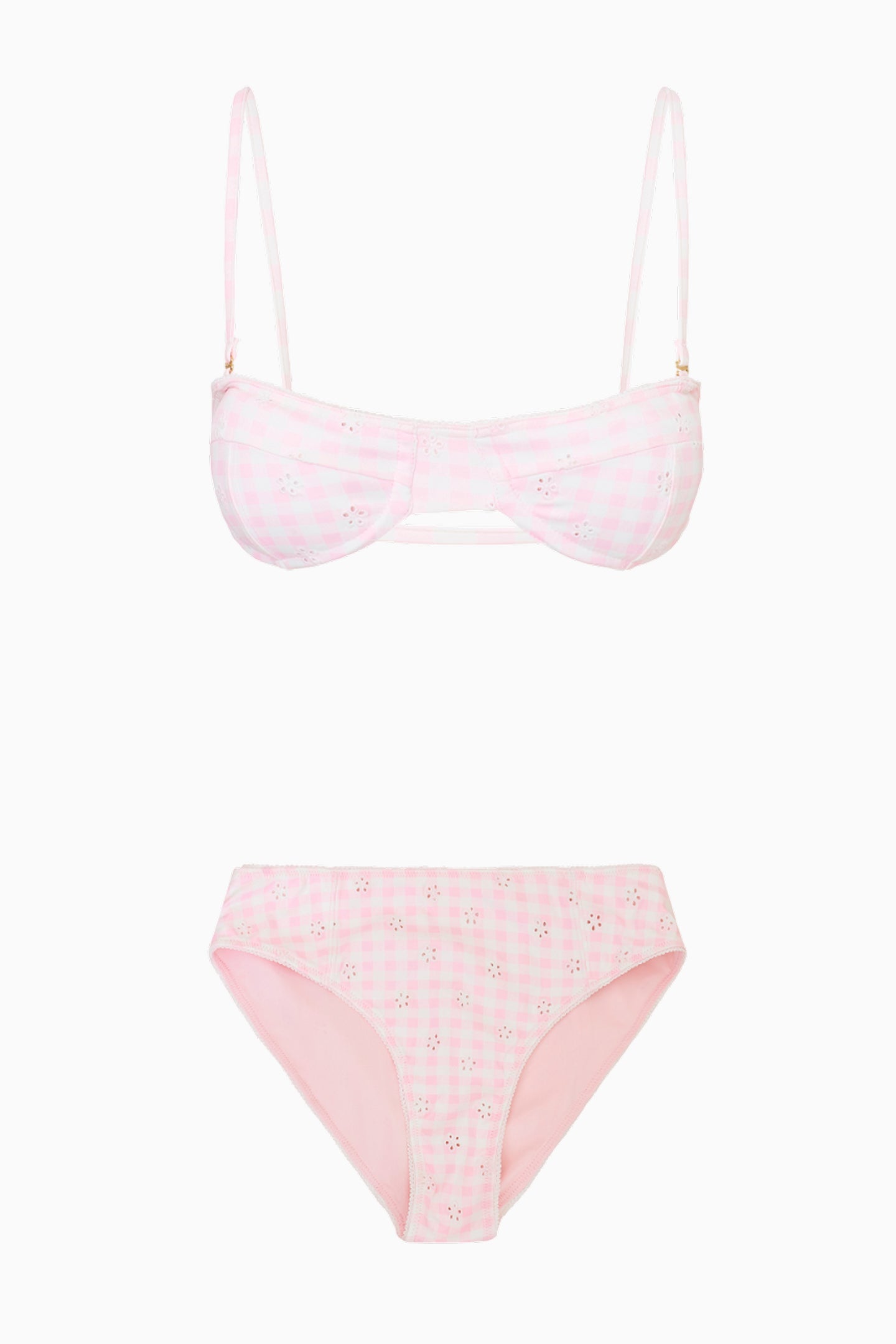 Step into sunshine in the Zofia Bikini. This flirty two piece arrives with a feminine gingham print with eyelet details. The top has an underwire for support while the bottoms are slightly low-rise with a bit of coverage at the back.